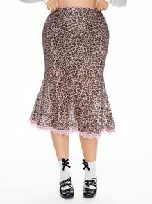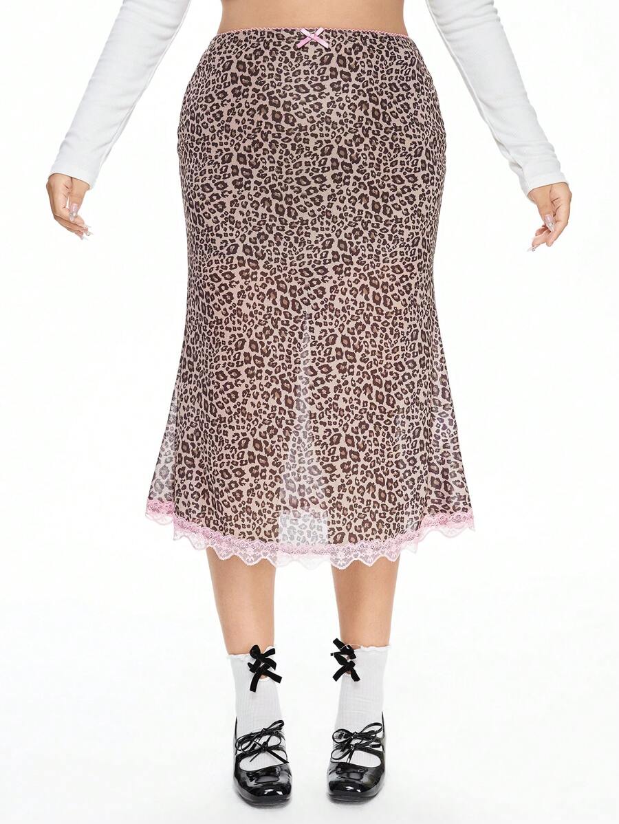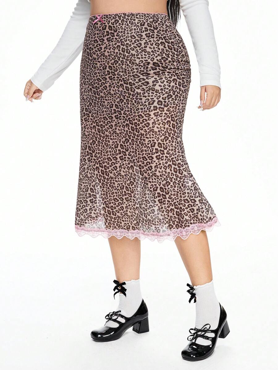 J-Fashion Mini-jupe en maille à imprimé léopard avec découpe en dentelle et nœud papillon pour femmes de grande taille dans le style Y2K
