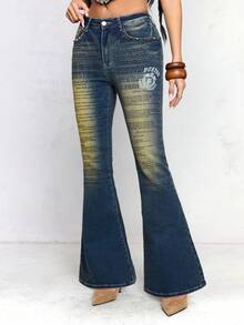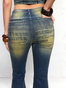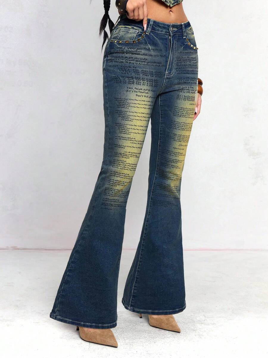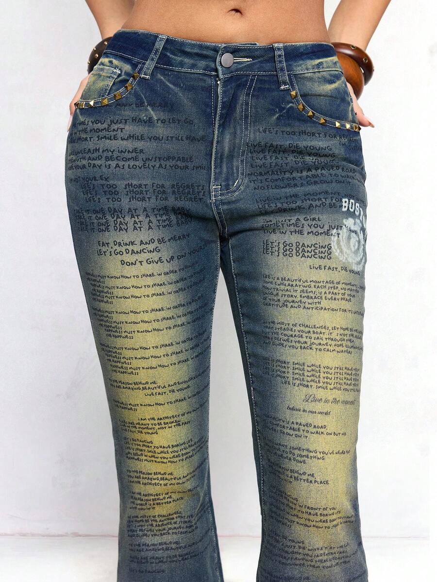 J-Fashion Jeans évasés ajustés avec imprimé texte métallique rétro Y2K Millennium Babe pour femmes