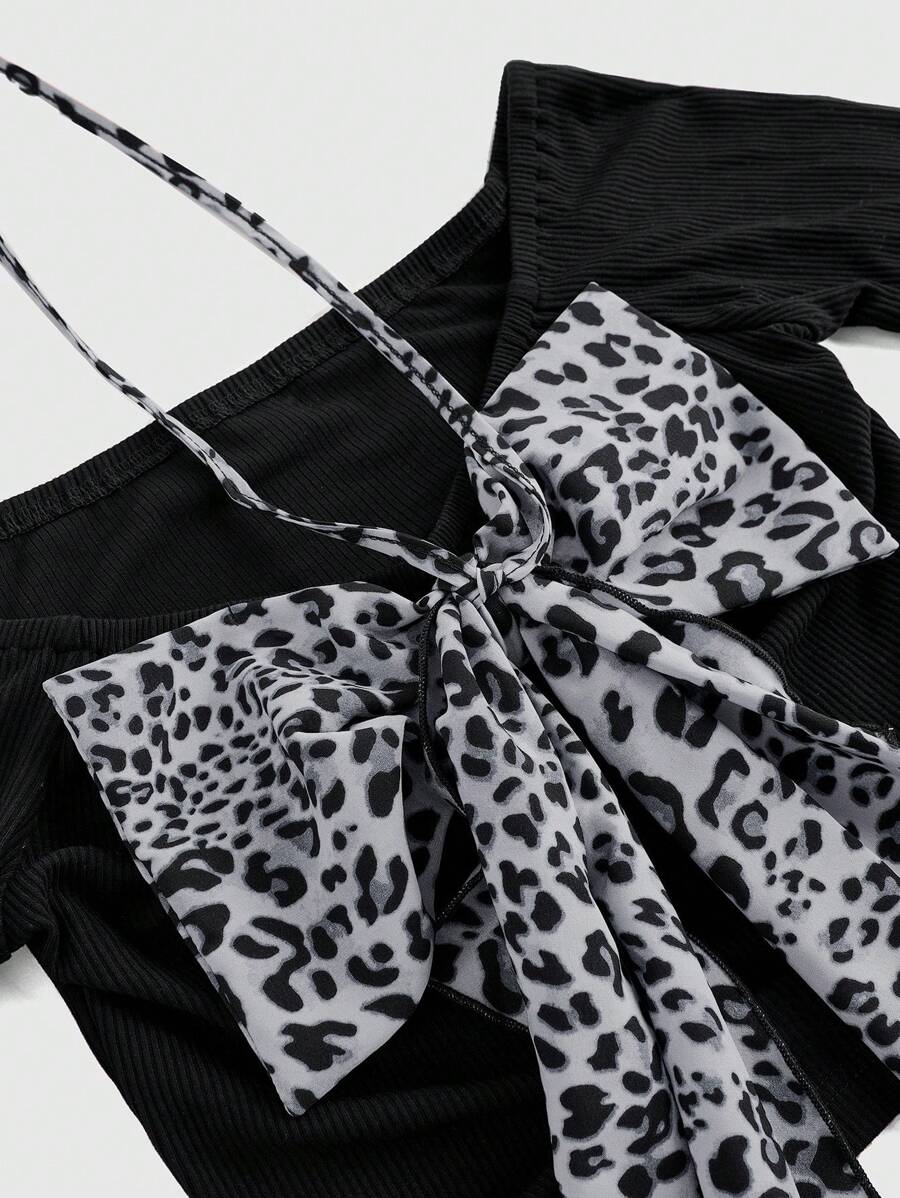 J-Fashion T-shirt de femme avec découpe à l''épaule, style rétro Y2K, imprimé léopard surdimensionné et grand nœud