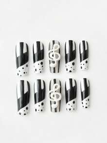 Kawaii 10 pièces Faux ongles de haute qualité peints à la main avec motifs ailes mignonnes, notes de musique, étoiles et pois avec bordure en dentelle + 3 pièces Faux ongles en forme de cercueil adhésifs double face amovibles et réutilisables, stickers d'ongles avec élément nœud papillon, convient pour les vacances, les fêtes, la danse et le port quotidien