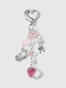 Kawaii 1 pièce Raffinée et mignonne pendentif de téléphone portable, porte-clés, breloque de sac en forme d'étoiles rondes en perles et cristaux, avec un nœud fraise, dans un style académique minimaliste pour fille. Convient pour les femmes, usage quotidien, cadeau de vacances, Saint-Valentin