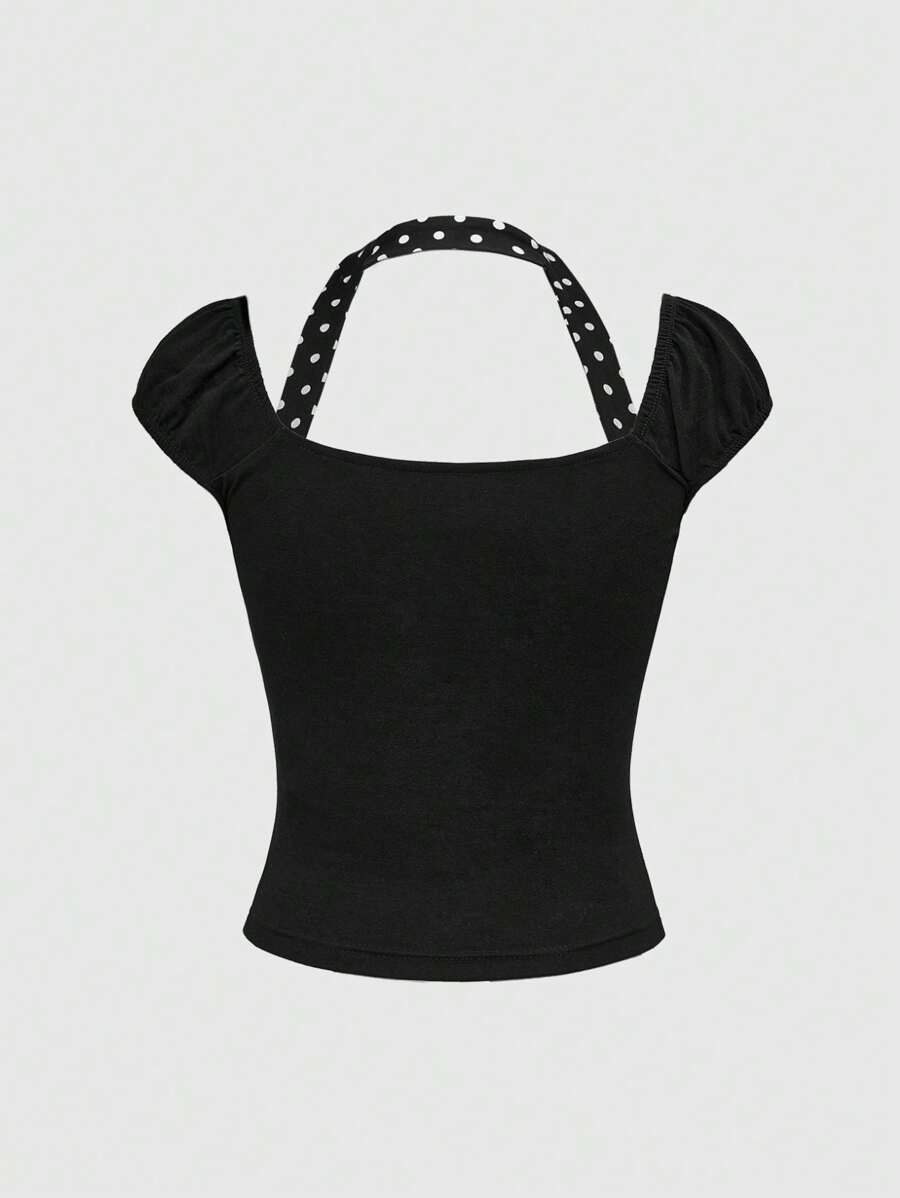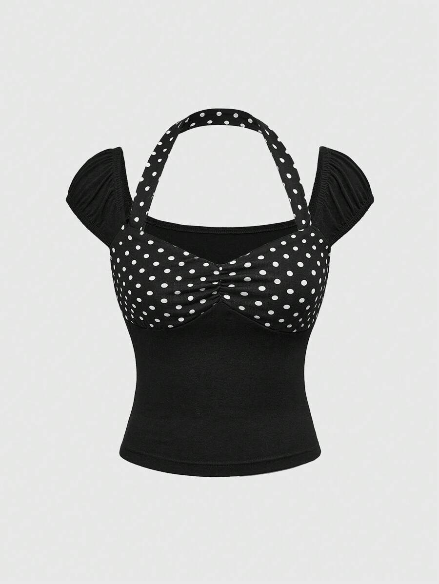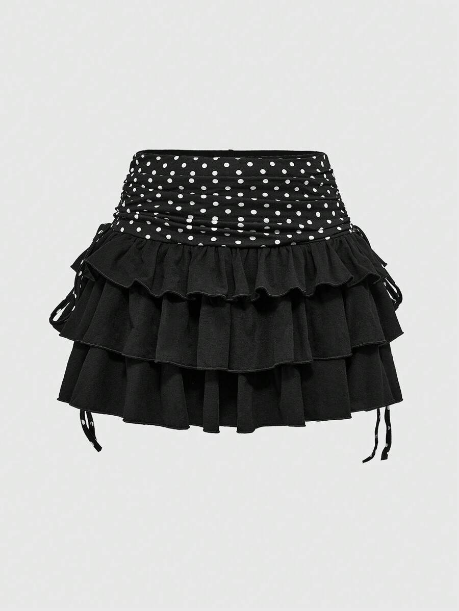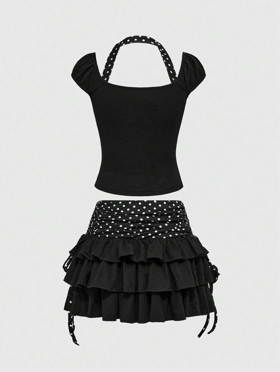 Kawaii 2 pièces Sets Femme d'été - Débardeur Skinny à motif à pois et jupe à ourlet de gâteau