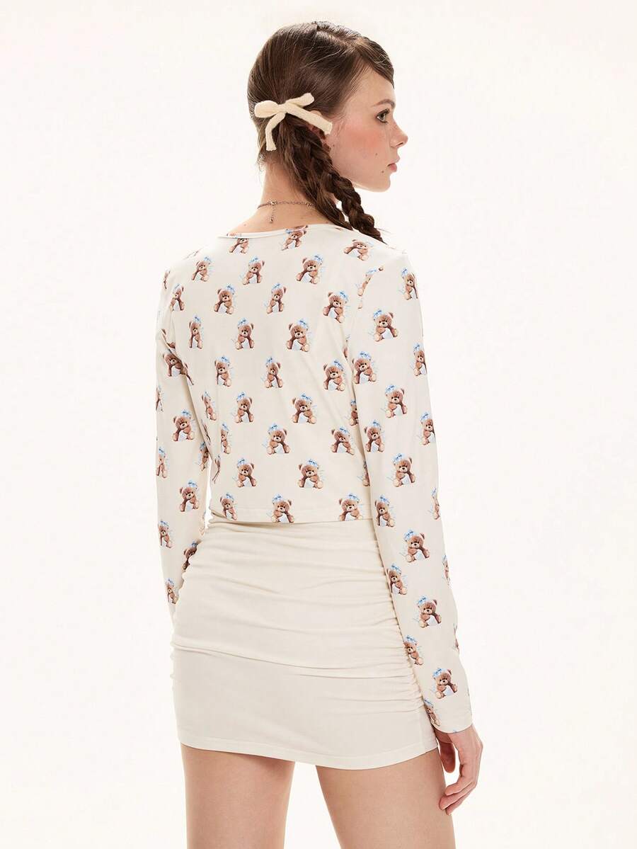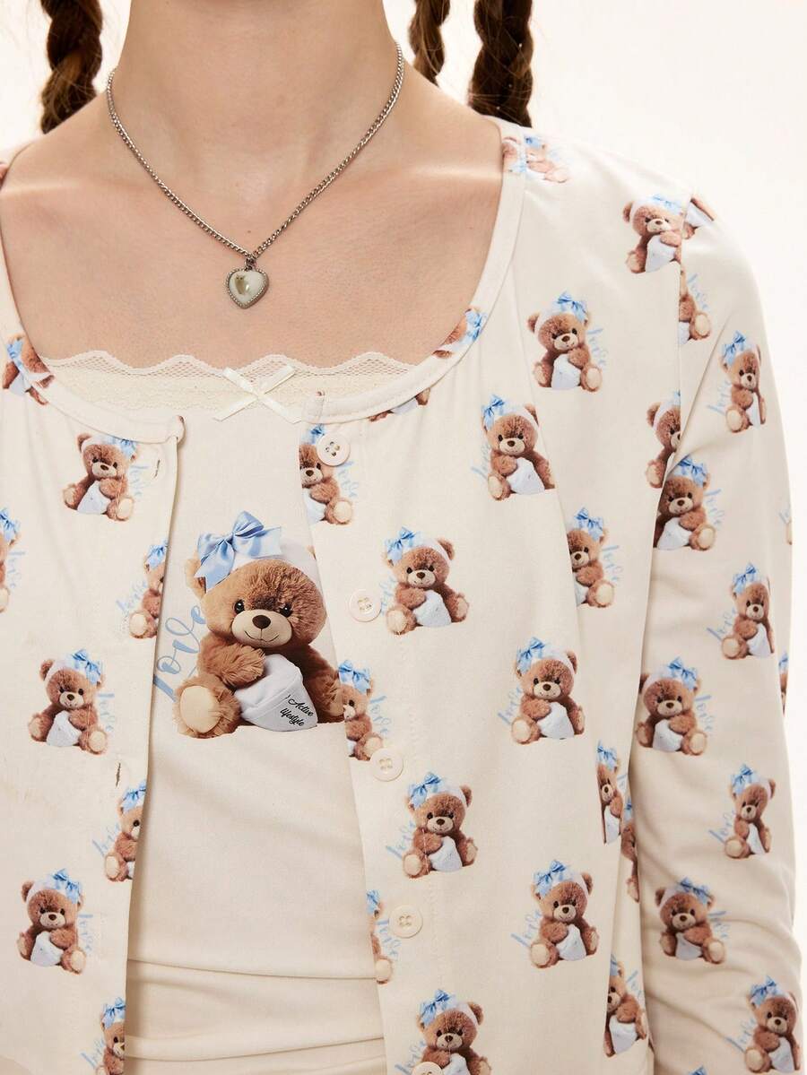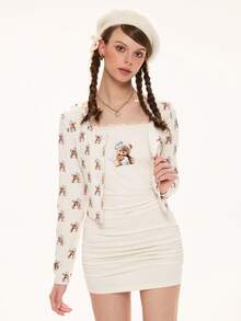 Kawaii 2 pièces/set Veste de cardigan décontractée mignonne d'ours assortie avec une robe mini sexy à empiècement en dentelle pour femmes