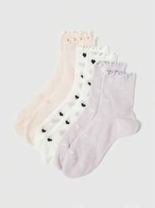 Kawaii 3 paires de chaussettes mi-mollet avec dentelle de couleur aléatoire, chaussettes mailles cœur mignonnes, chaussettes femme style college avec blocs de couleurs, chaussettes mailles courtes avec motifs dessin animé pour utilisation quotidienne