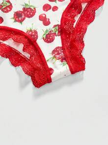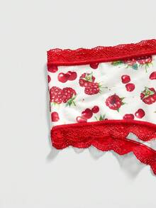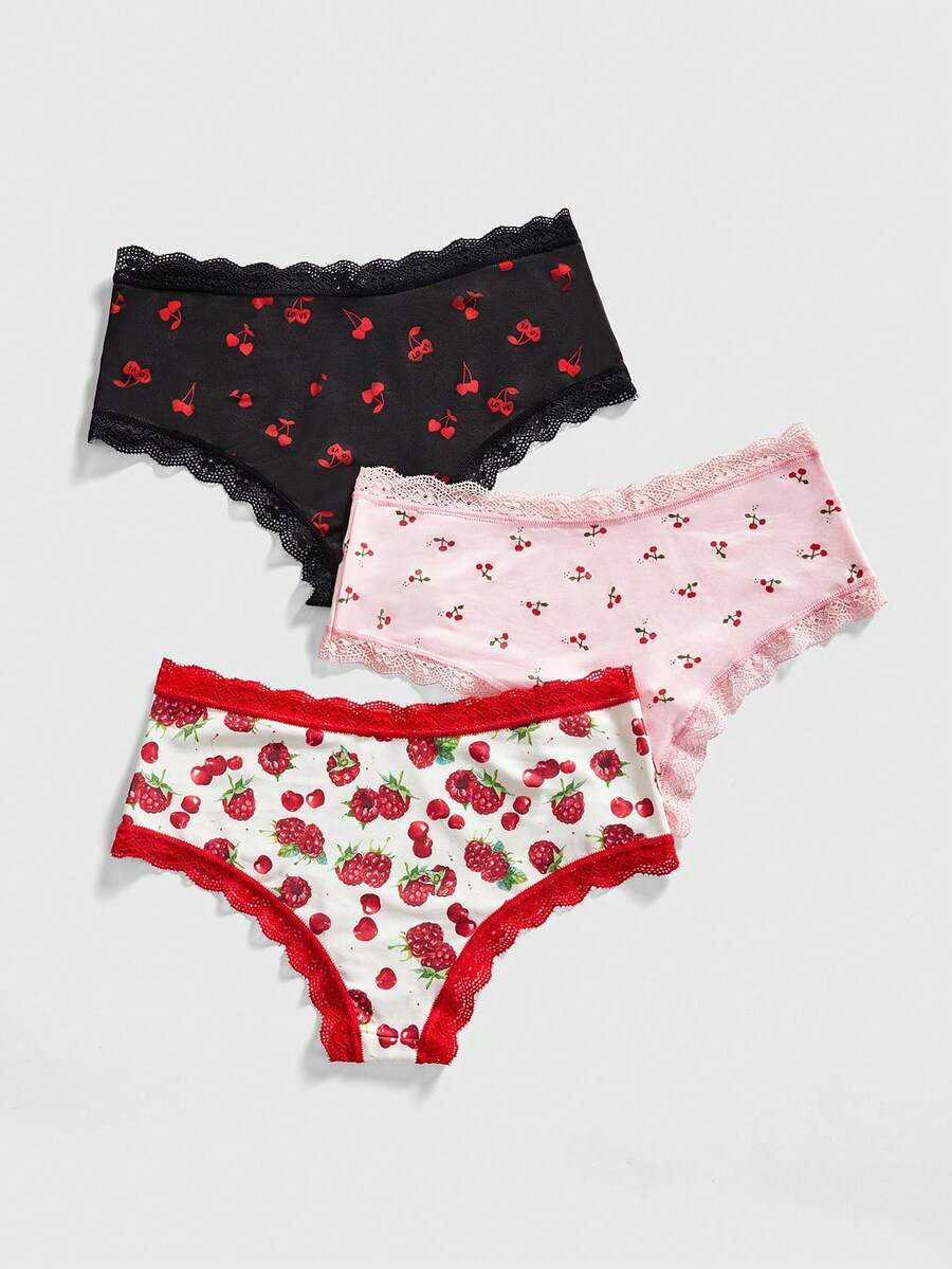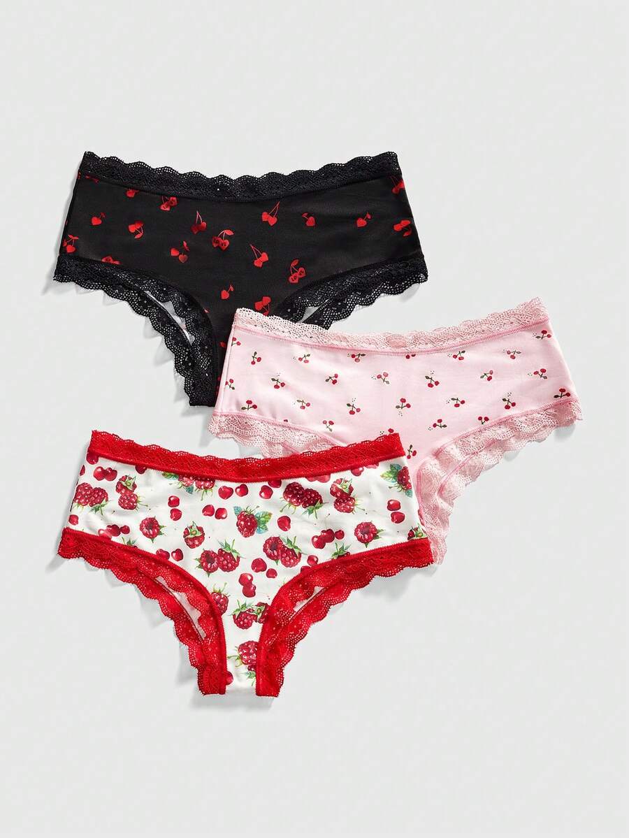 Kawaii 3 pièces/set Culottes mignonnes avec motif de fraise et de cerise, en dentelle et patchwork