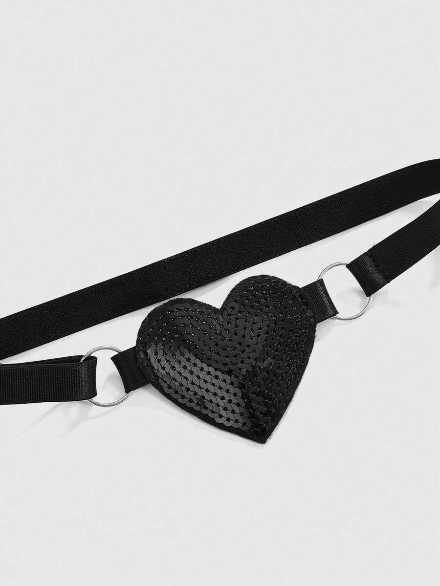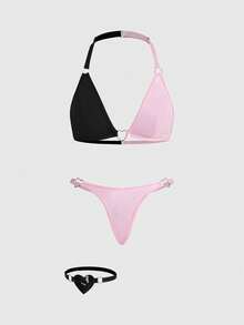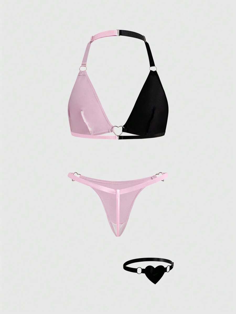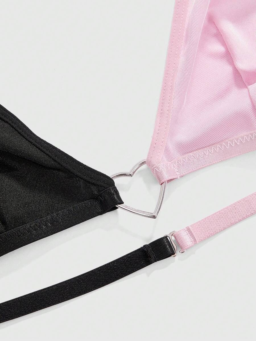 Kawaii 3 pièces Ensemble de lingerie sexy : Brassière ras-du-cou mignonne, Culotte string, Jarretière avec paillettes en forme de cœur, Saint-Valentin romantique