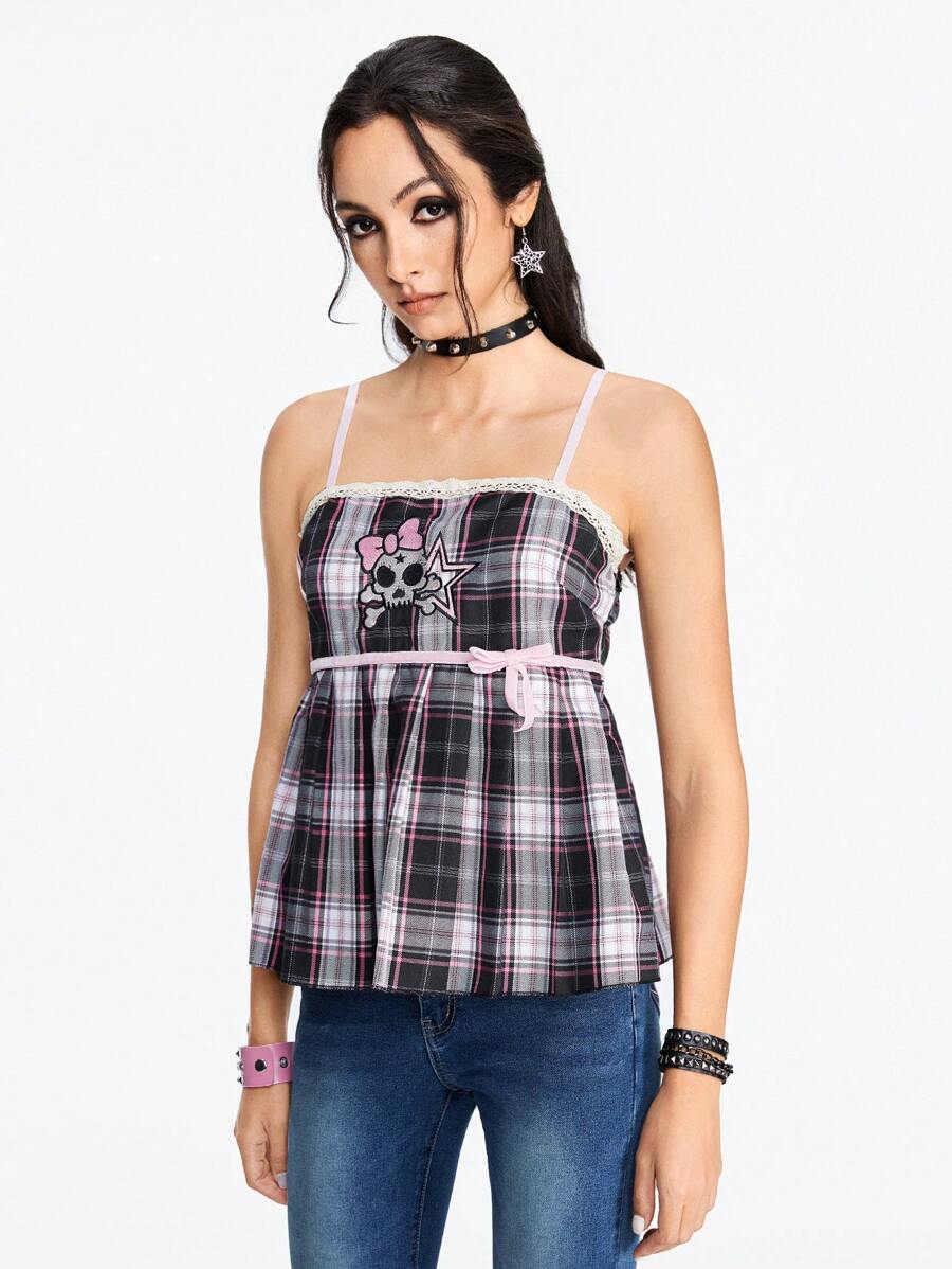 Kawaii Blouse femme à volants avec imprimé carreaux noir et rose, avec nœud crâne brodé