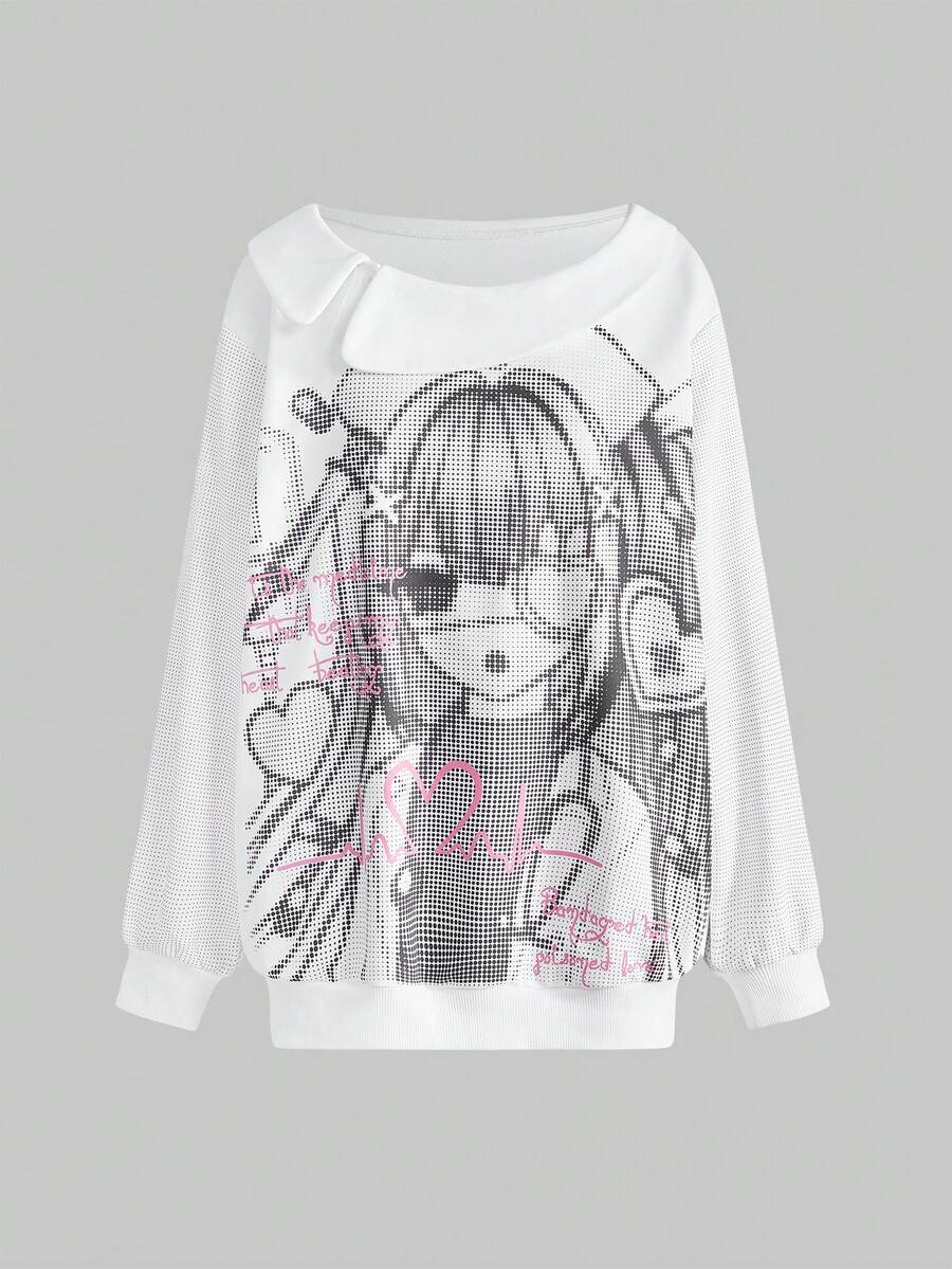 Sweat-shirt femme à col claudine, épaules obliques, style kawaii, mignon, dessin animé, personnage anime
