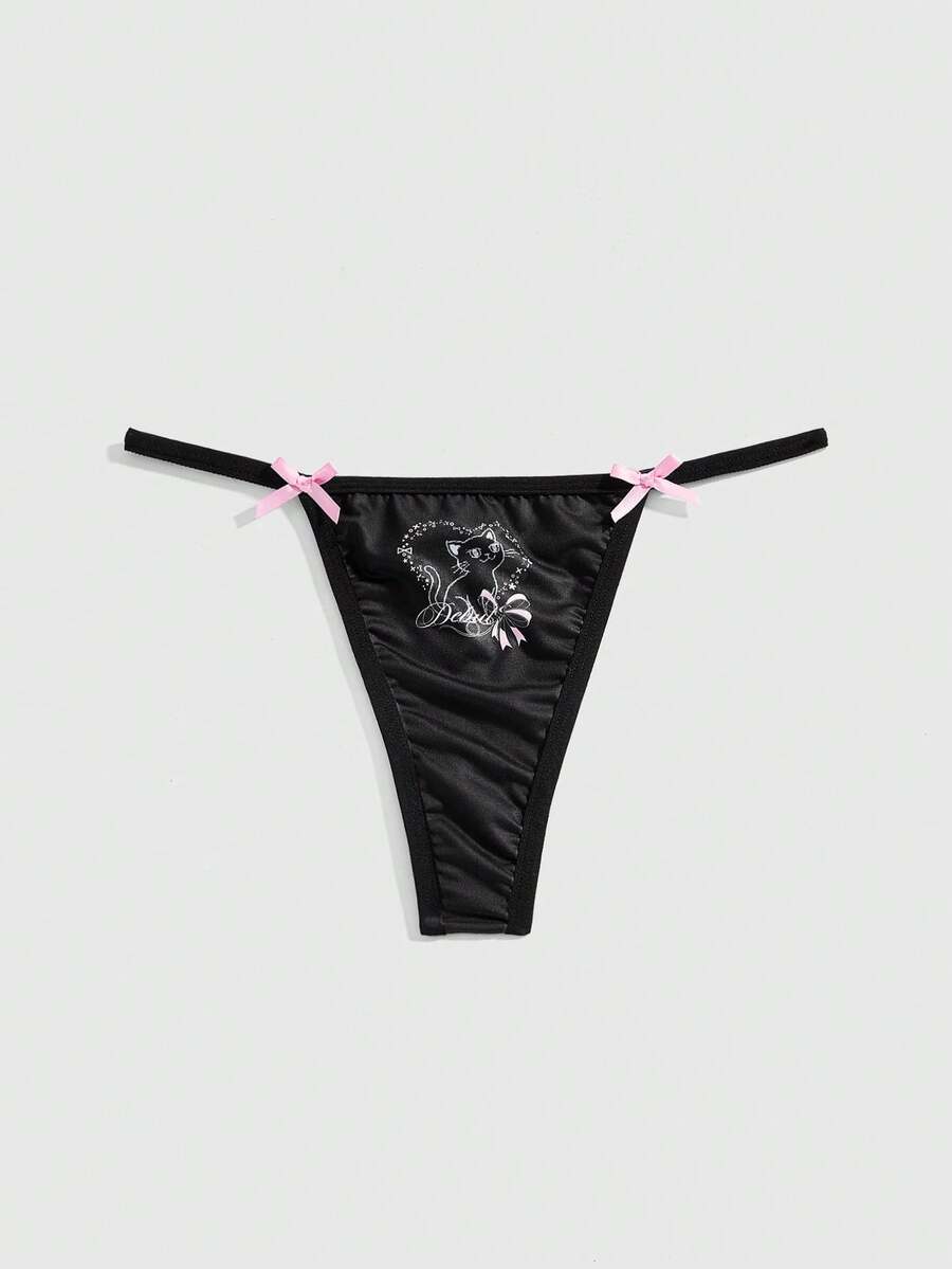 Kawaii Culotte tanga à bordure étroite avec symbole mignon de chat, cœur, texte anglais, nœud papillon