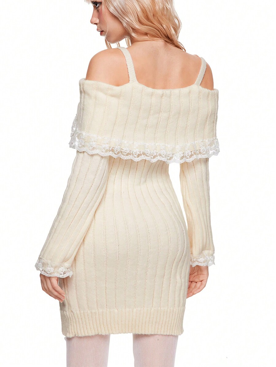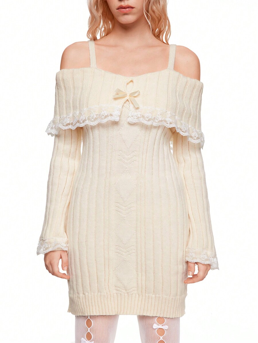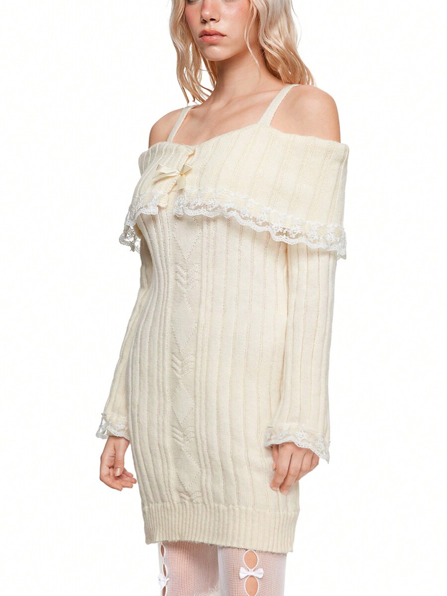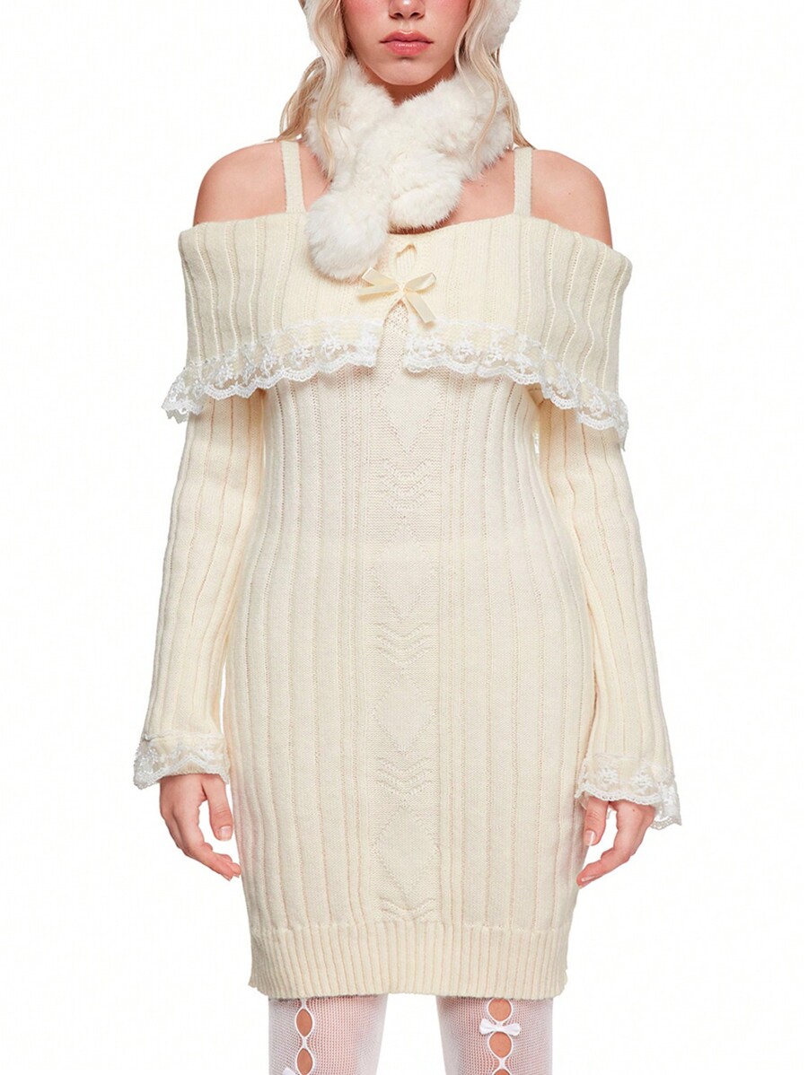 Kawaii Robe pull mignonne et douce en tricot avec patchwork de dentelle pour femme