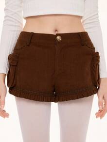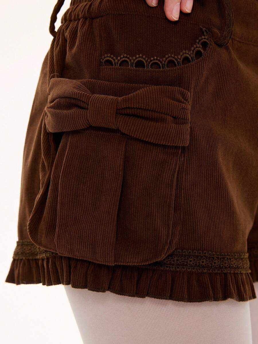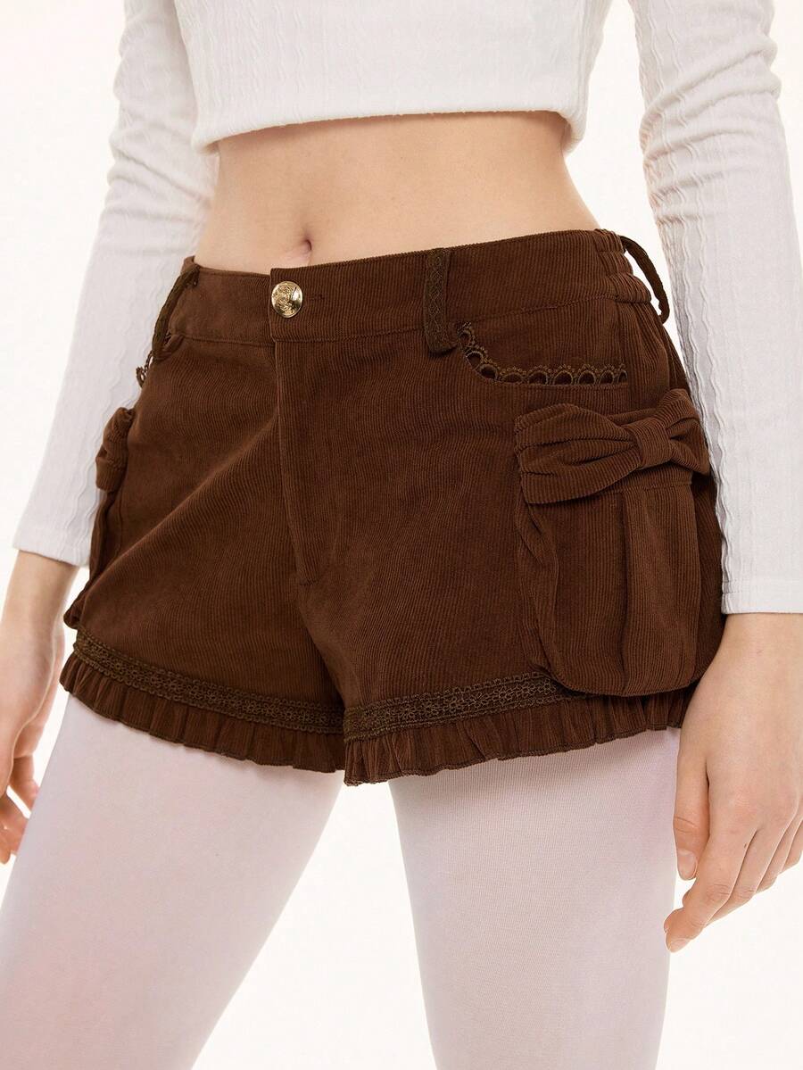 Kawaii Shorts en velours côtelé à taille basse avec décoration de nœud en dentelle vintage patchwork 3D pour femmes