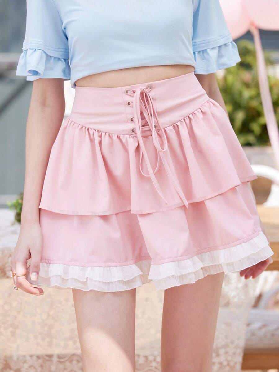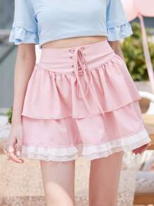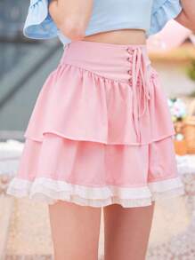Kawaii Jupe Lacets Volants superposés Casual Blocs de couleur