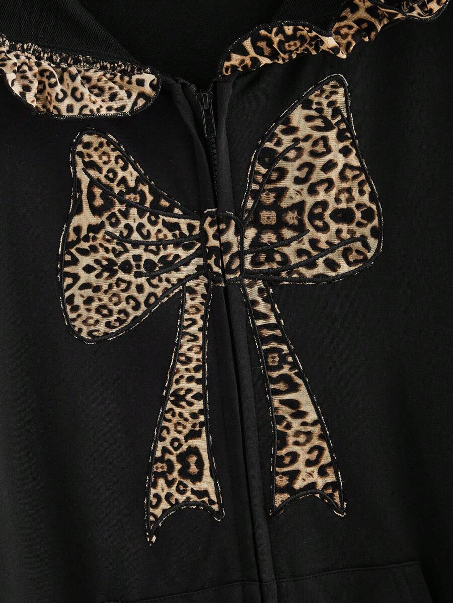 Kawaii Sweat-shirt à capuche avec volants bordés de motifs imprimés léopard et nœud pailleté