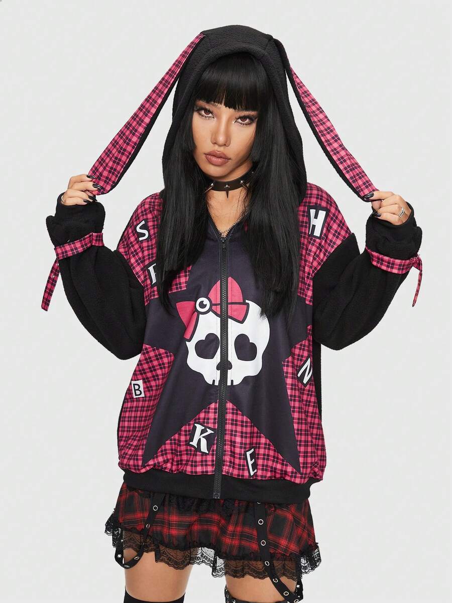 Kawaii Veste À Carreaux Motif Tête De Mort Épaule tombante À Capuche