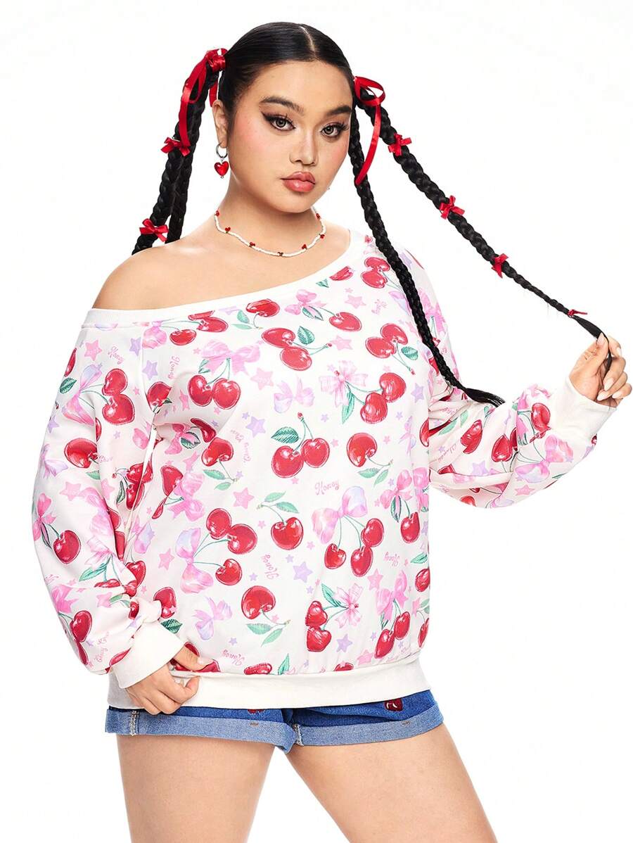 Kawaii Sweat-shirt d'épaule oblique avec imprimé de nœud et fleurs de cerisier pour grande taille, printemps