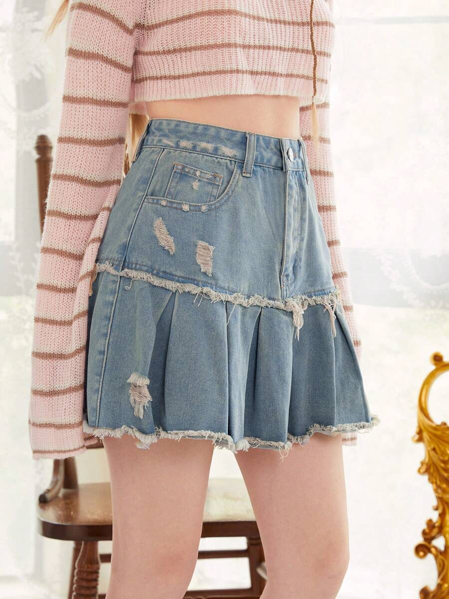 Kawaii Jupe En Jean Déchiré Plissé À Ourlet Effiloché