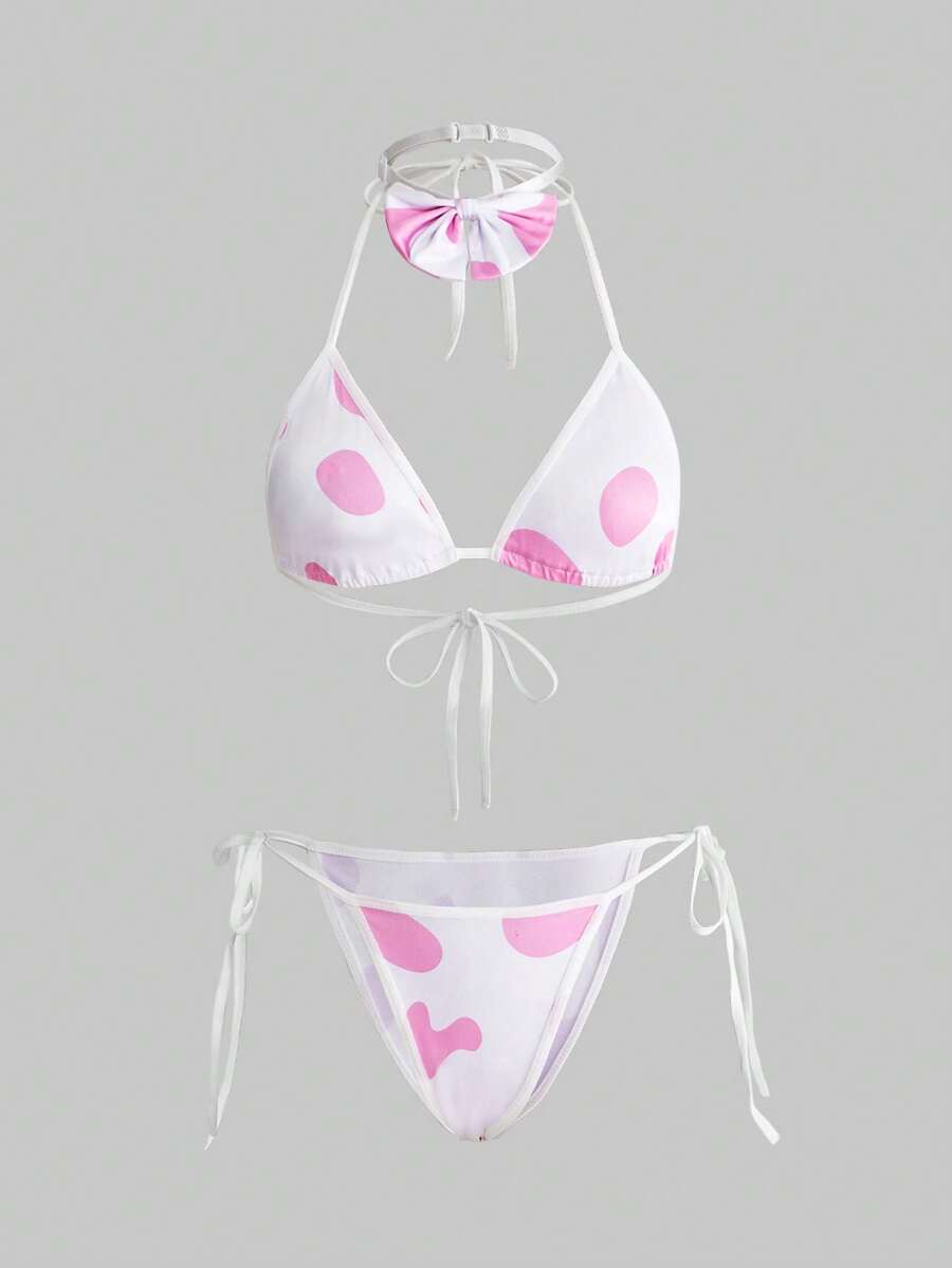 Kawaii Ensemble de soutien-gorge et culotte nœud papillon imprimé vache sexy, lingerie séduisante pour femmes, Halloween
