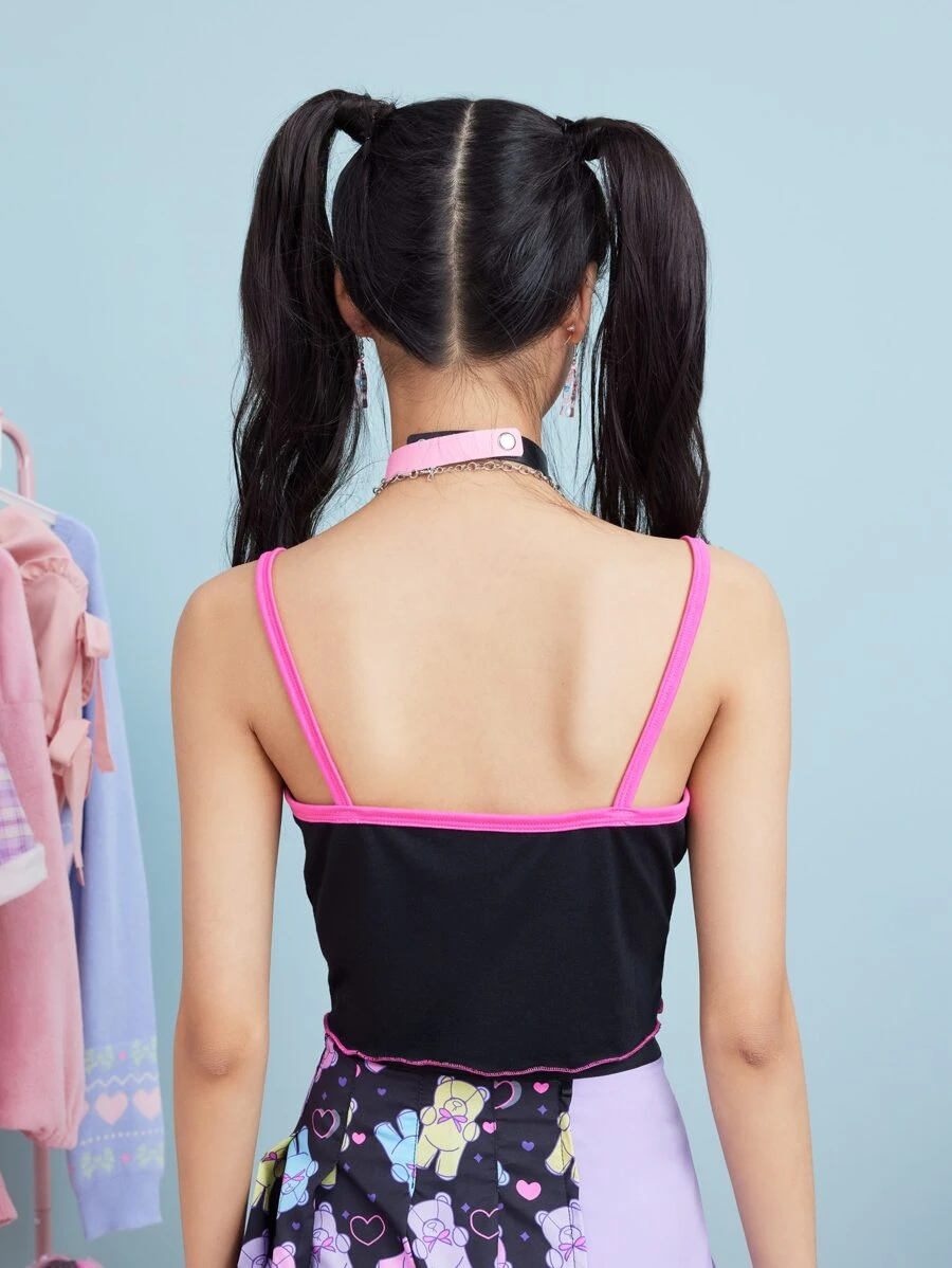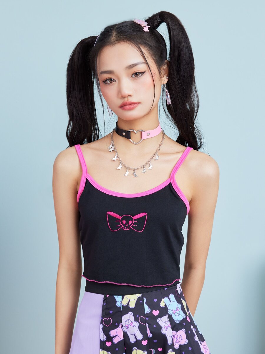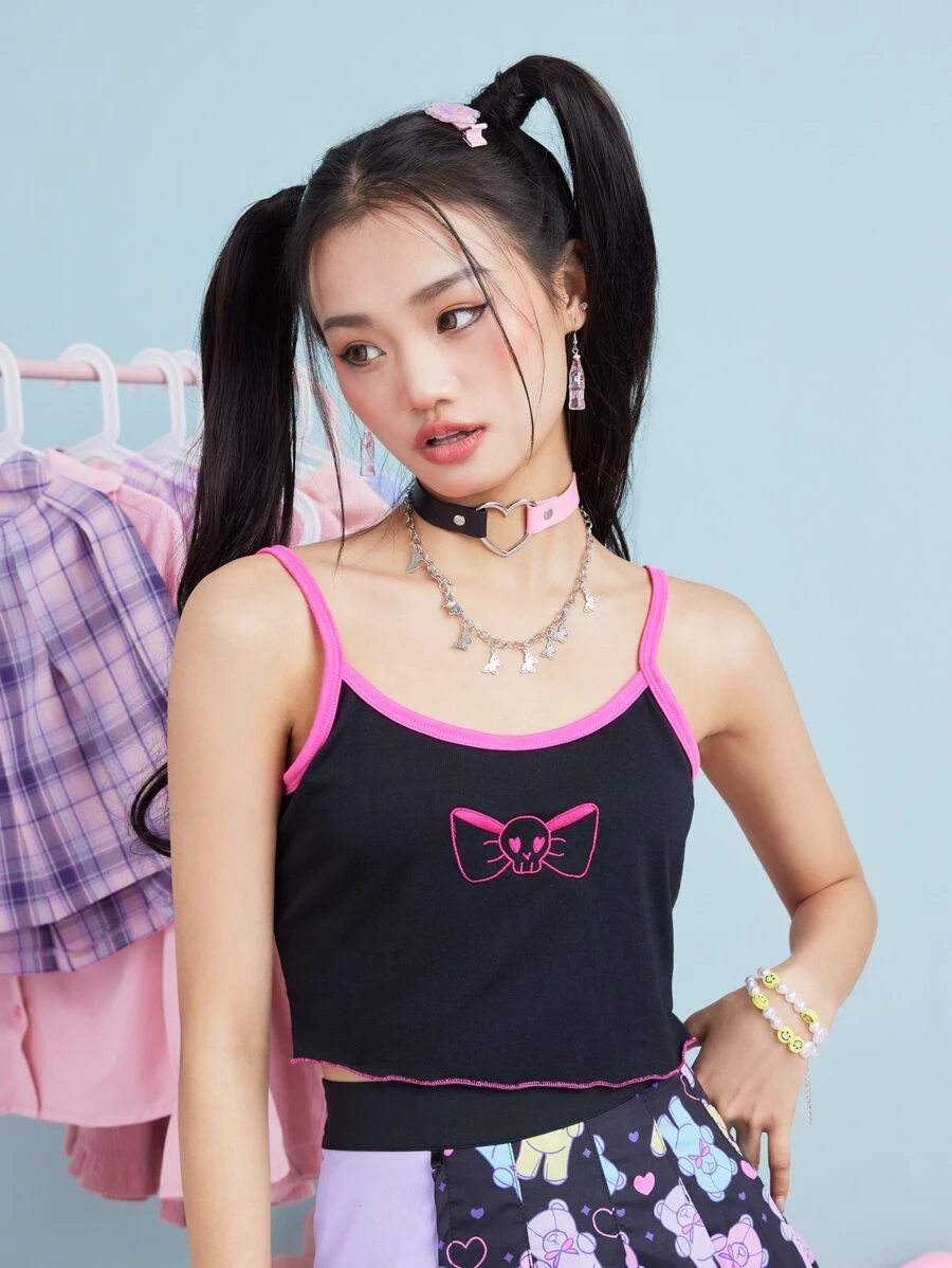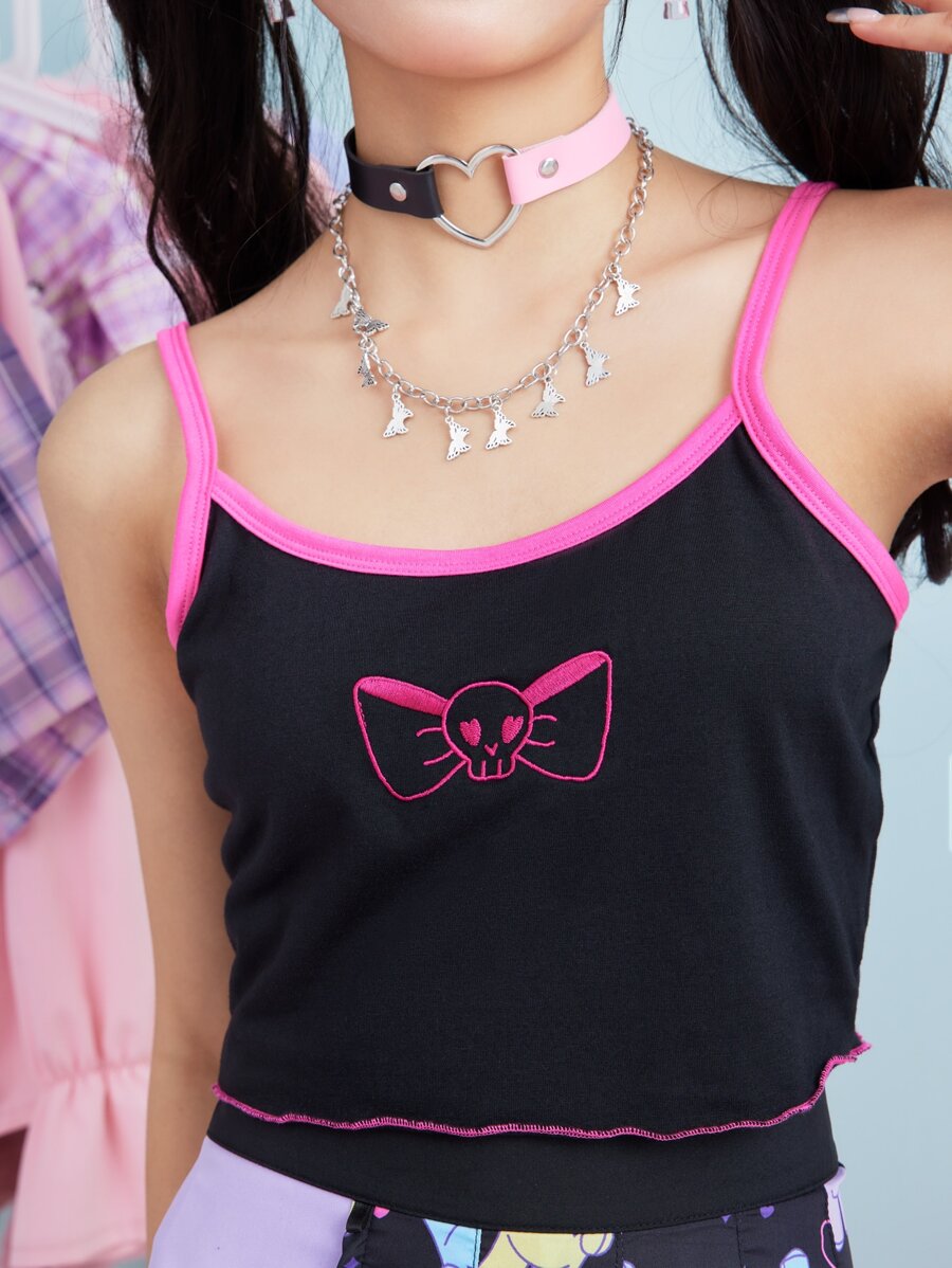 Kawaii Top à fines brides court tête de mort & à nœud à broderie