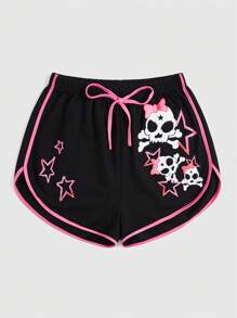 Kawaii Shorts à bordure contrastante imprimé crâne adapté pour les sports