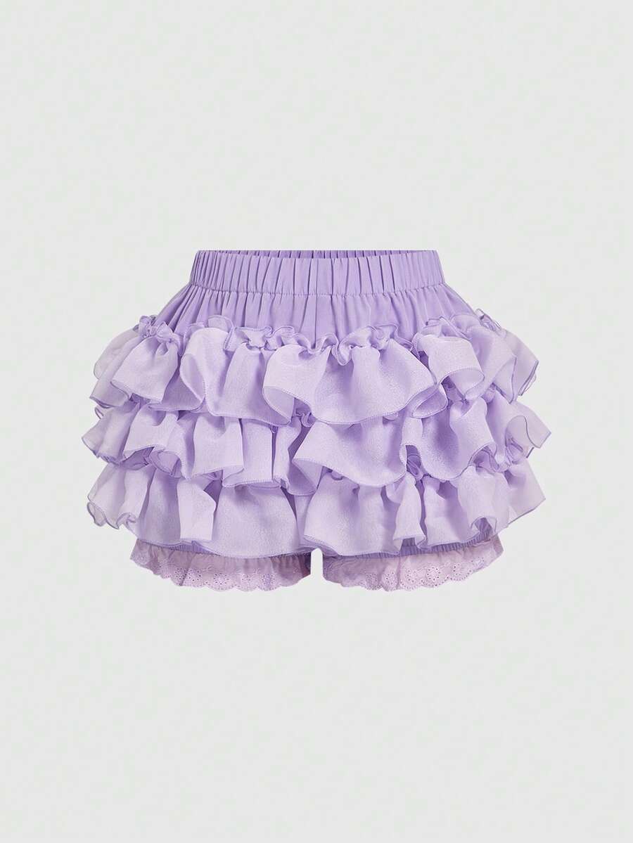 Kawaii Short femme mode été couleur unie taille élastique volants multicouches ourlet