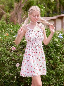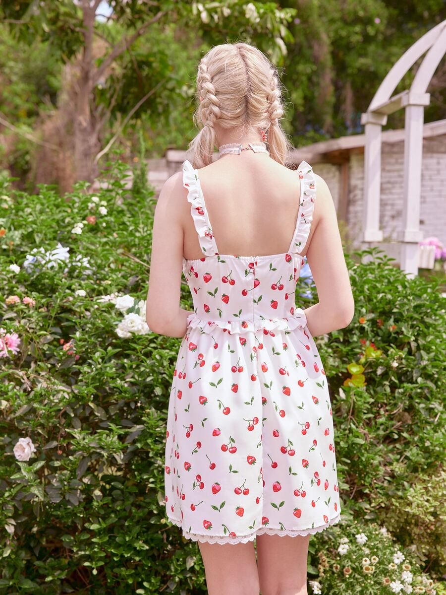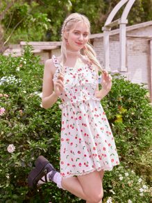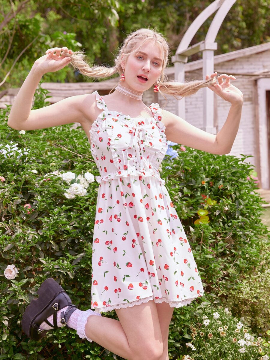 Kawaii Robe à fines brides à imprimé cerise et fraise à lacets