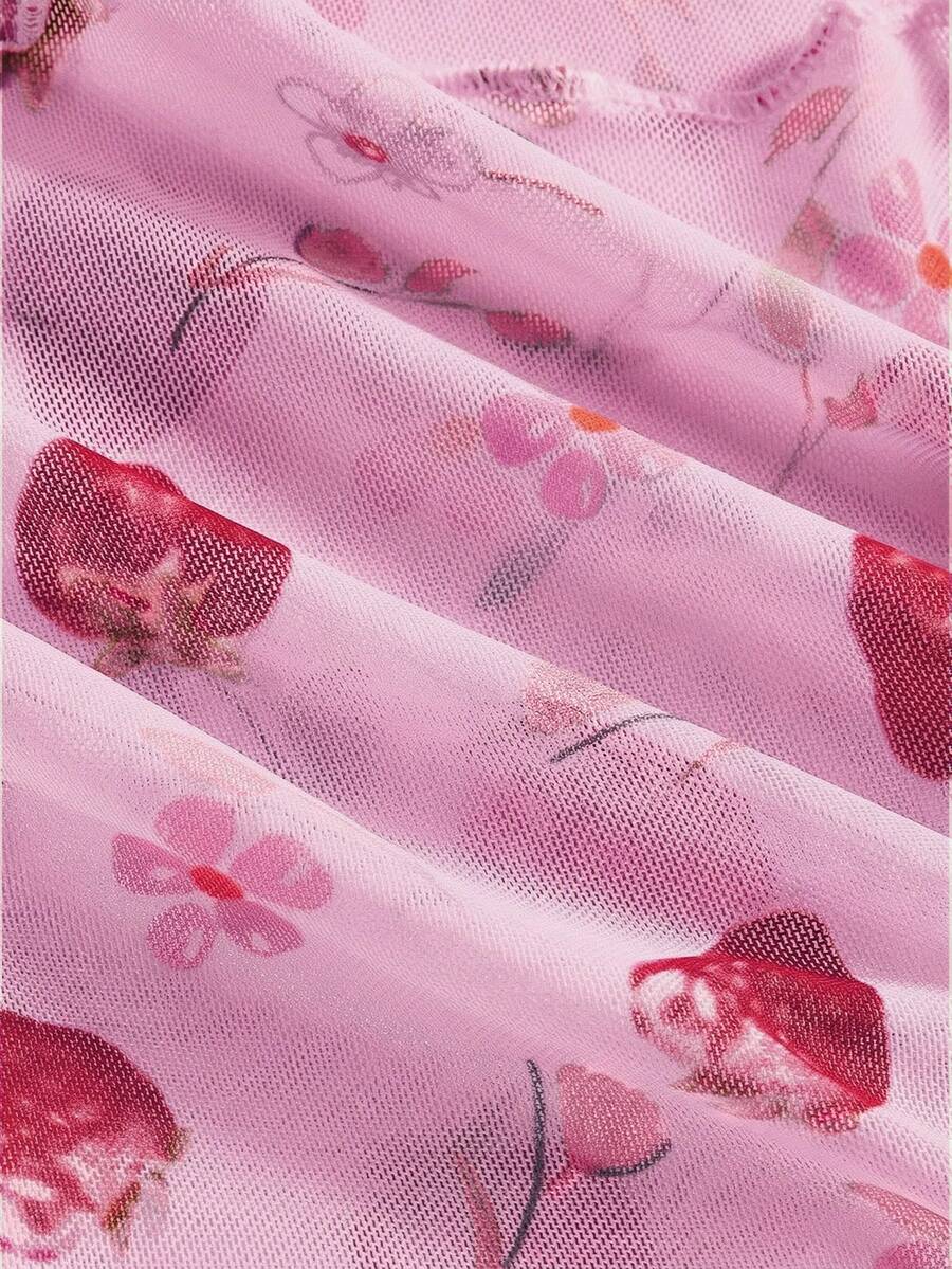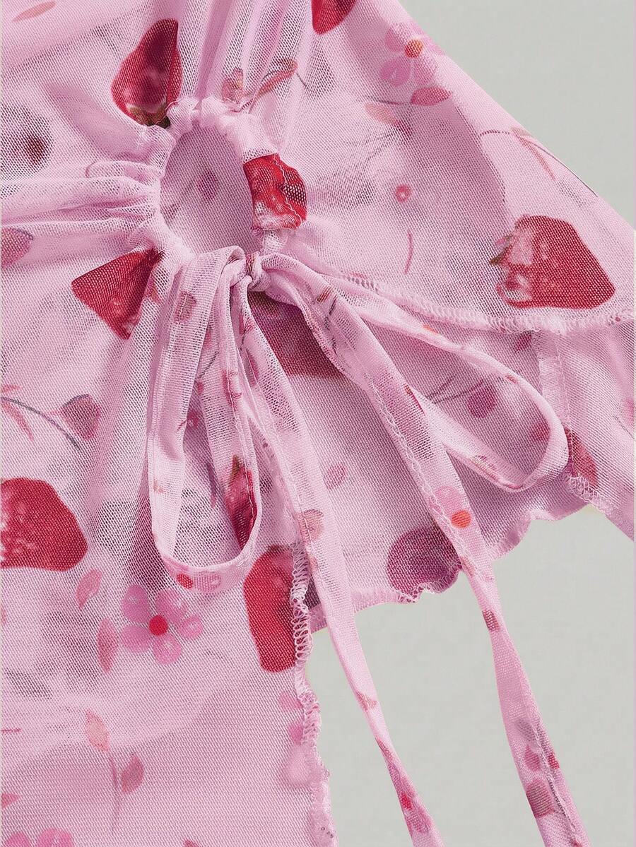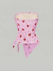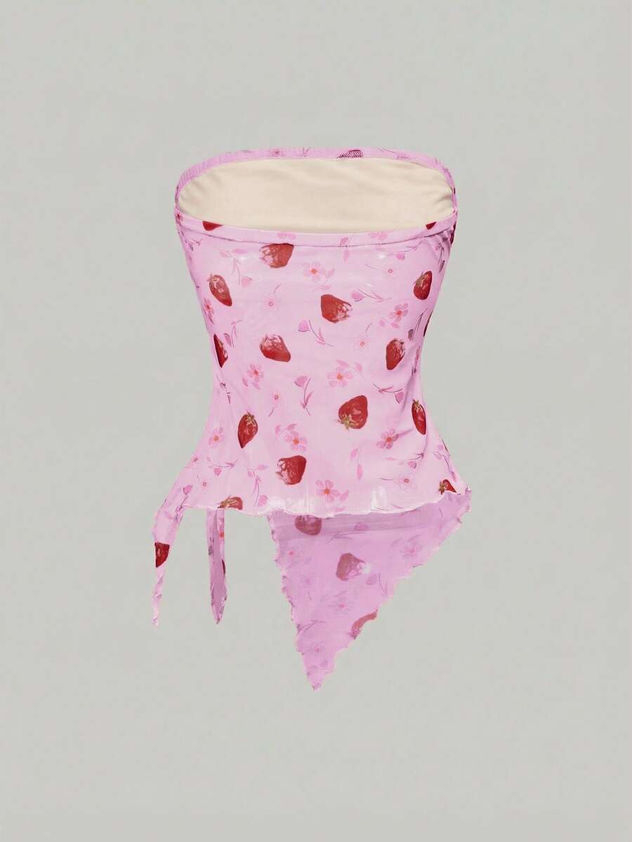 Kawaii Top tube d'été à ourlet asymétrique imprimé fraise, blouse en tissu de maille style Y2K