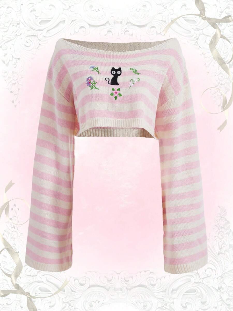 Kawaii Chandail court à rayures avec graphique de bande dessinée, école