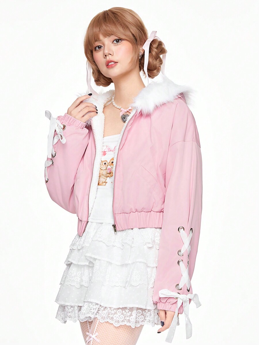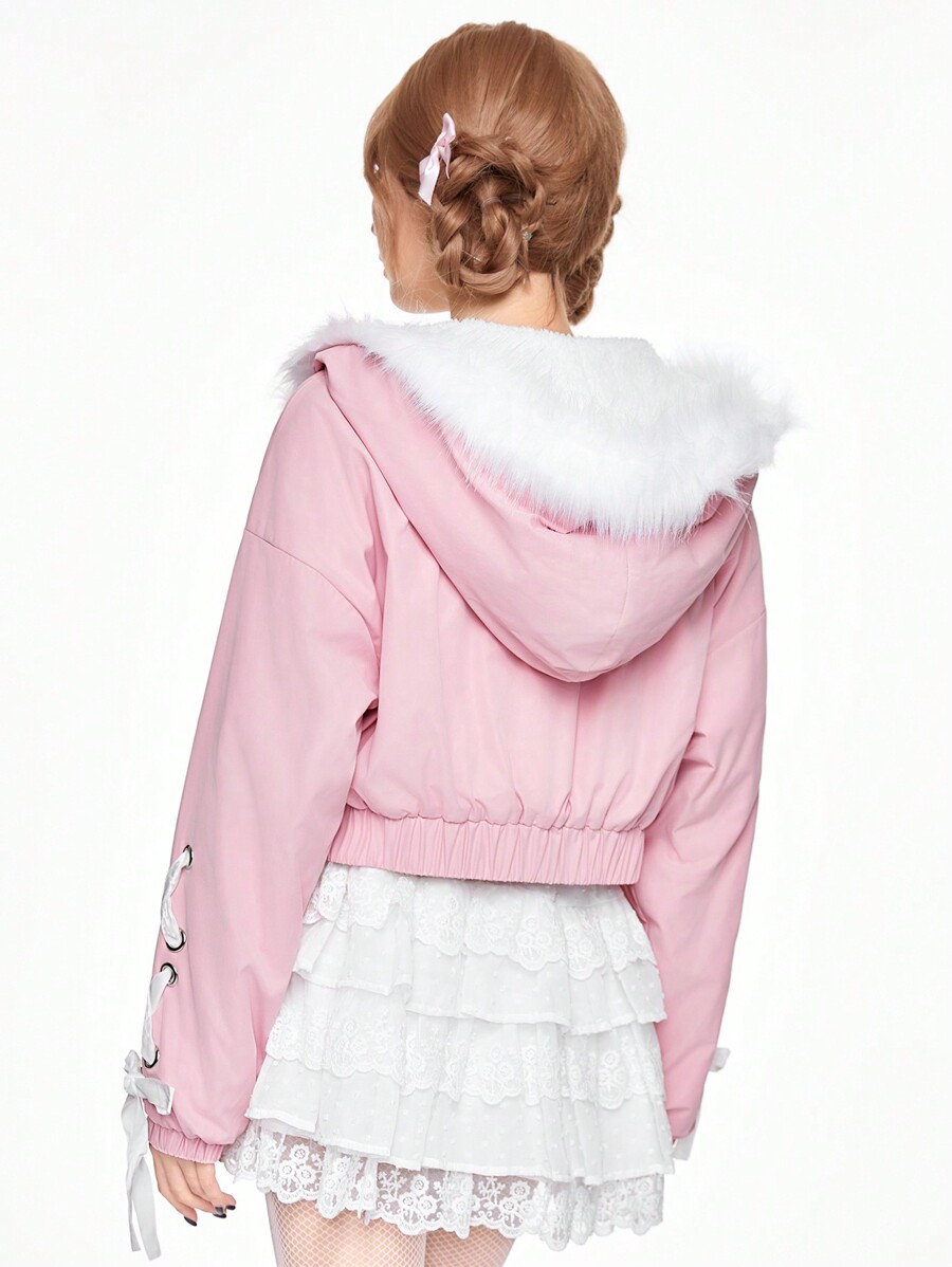 Kawaii Veste pour femmes avec nœud ruban neige et bordure en fausse fourrure, douce et mignonne