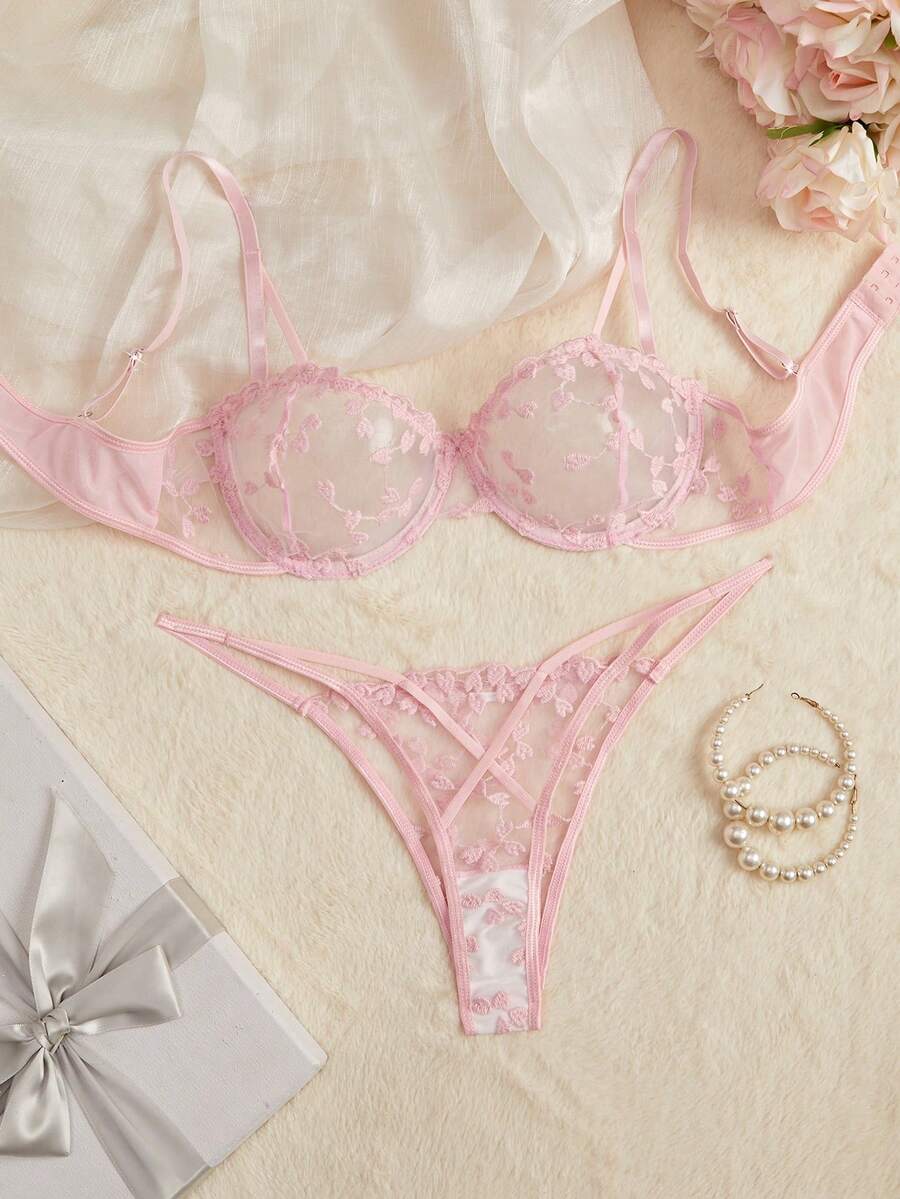 Kawaii Ensemble de lingerie sexy en maille avec broderie en forme de cœur pour femmes