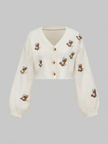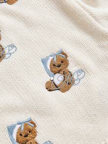Kawaii Ensemble 2 pièces : Robe nuisette en tricot avec nœud papillon et ours brodé, décolleté sexy en V pour femmes + Cardigan en tricot avec ours brodé, décolleté en V et épaules dénudées pour femmes