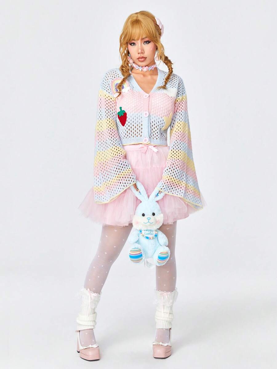 Kawaii Cardigan ajouré en crochet à motif arc-en-ciel fraise pour femmes, pour l'école