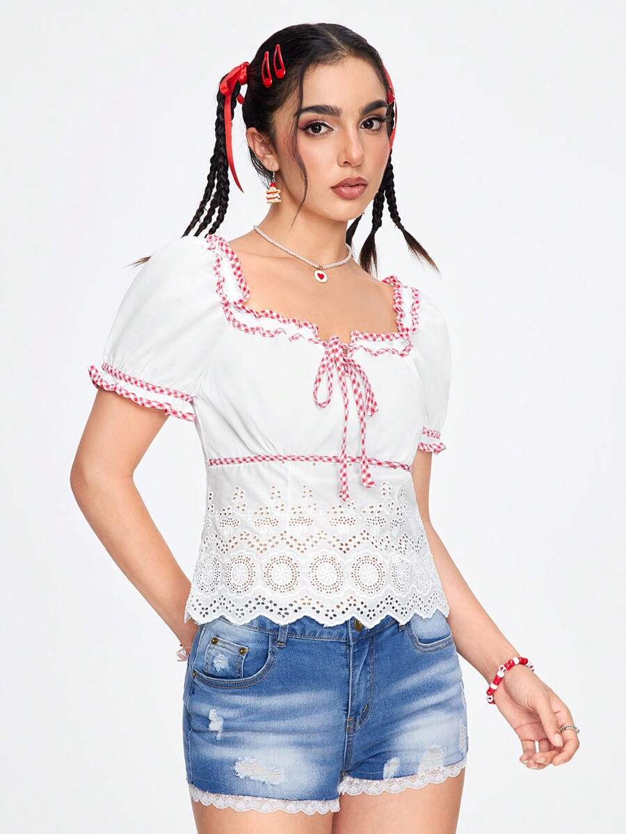 Kawaii Chemisier d'été décontracté pour femmes à carreaux, garniture en patchwork ajouré brodé