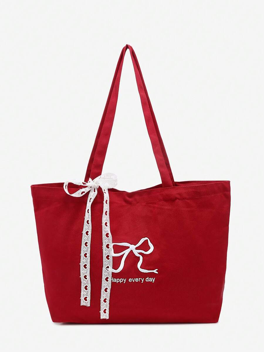 Kawaii Sac fourre-tout vintage pour femmes avec nœud papillon, broderie et slogan anglais. Sac à main grande capacité avec nœud papillon, convient pour le shopping et l'école. Sac mignon avec nœud papillon pour femmes