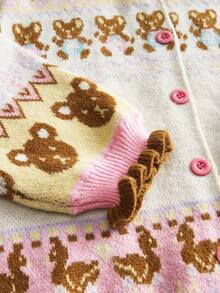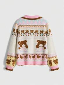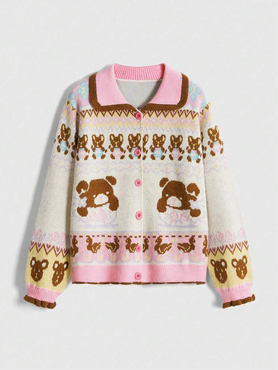 Kawaii Cardigan femme Y2K mignon en jacquard avec ours et canard, col contrasté