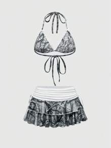 Kawaii Ensemble de bikini emblématique du Y2K avec patchwork en dentelle brodée et imprimé camouflage en couleurs contrastées