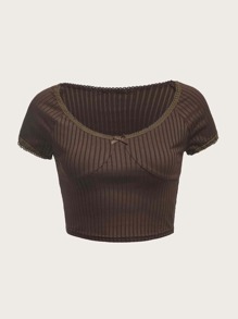 T-shirt court ourlet en dentelle à nœud papillon côtelé