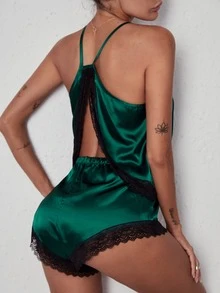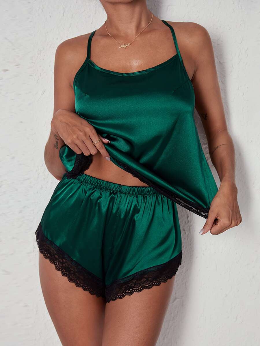 Ensemble de pyjama short & top à fines brides ourlet en dentelle en satin
