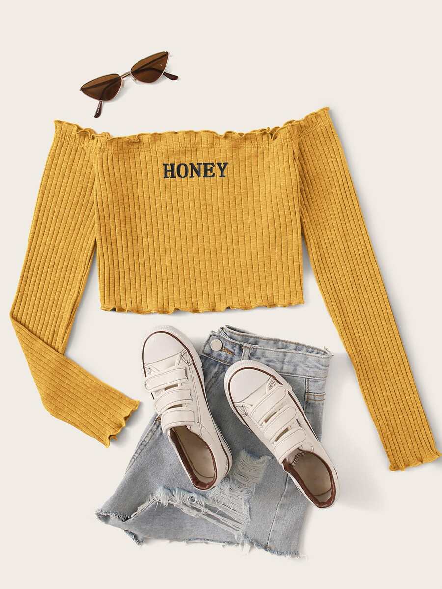 Top en tricot côtelé à col bardot à ourlet ondulé