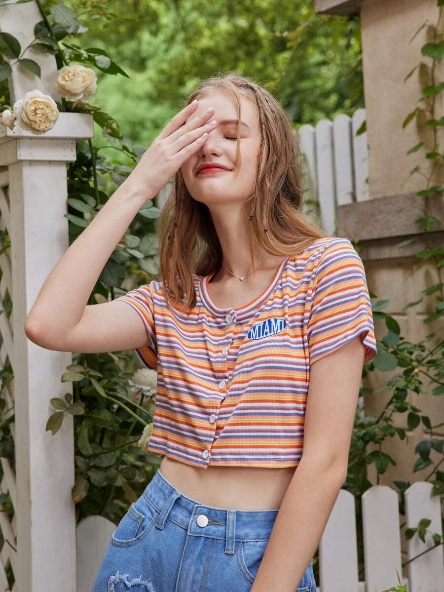 T-shirt à lettre à rayures à bouton