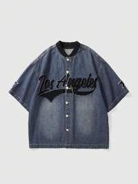 Street Life Chemise en jean casual ample à manches courtes avec imprimé de caractères pour hommes