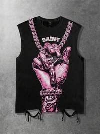 Grunge Punk Débardeur ample style punk de rue mode d'été pour hommes, imprimé lettres Vierge Marie avec ornements de strass