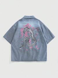 Anime Chemise en jean à manches courtes et à nœud devant avec imprimé dragon chinois pour hommes