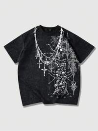 Goth T-shirt à épaule tombante avec imprimé croix et étoile pour homme, pour Halloween, école