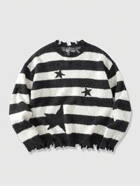 Street Life Pull ample décontracté de mode de rue pour hommes, motif rayé noir et blanc et étoiles avec bord effiloché. Automne/Hiver