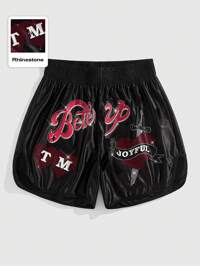 Street Life Short de boxe décontracté à la mode pour hommes, avec taille élastique, slogan et décoration de strass, pour l'été