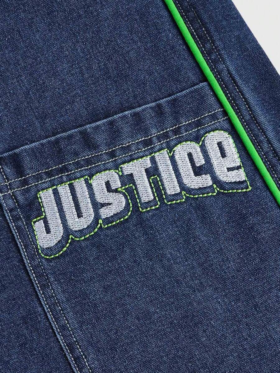 Pantalon 3/4 en denim large pour hommes avec ligne de contraste et graphique brodé, style streetwear