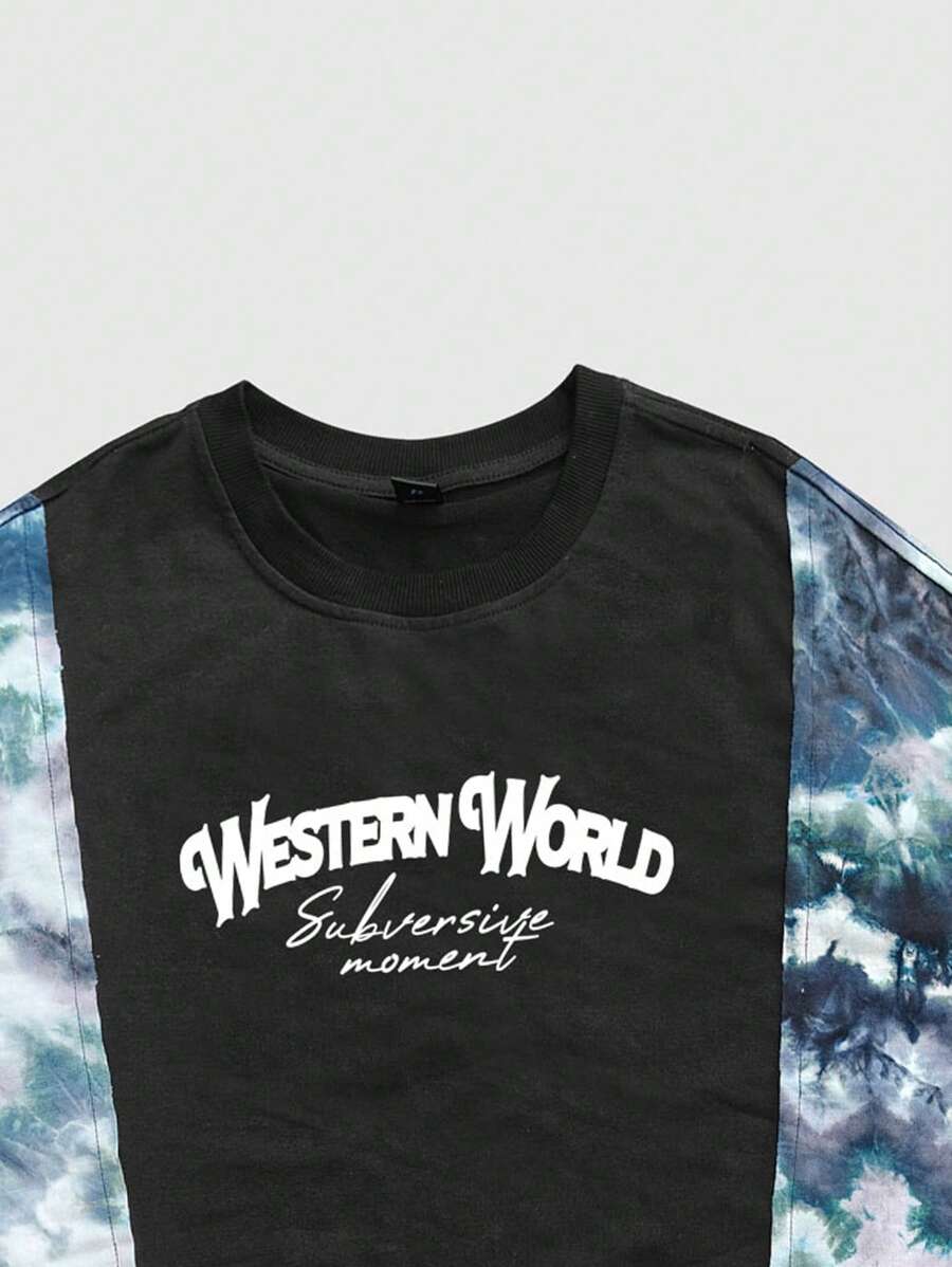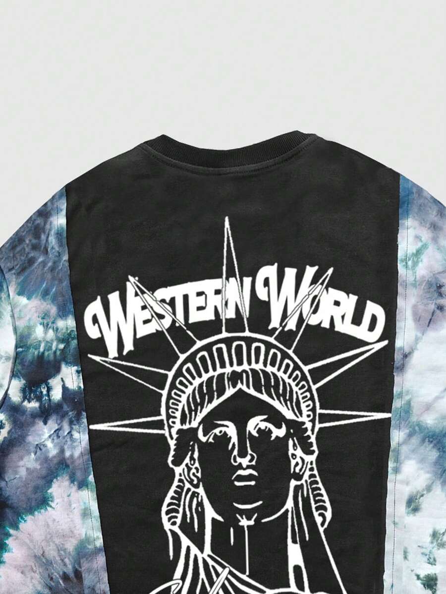 t-shirt homme graphique Statue de la Liberté noire avec patchwork et teinture nouée