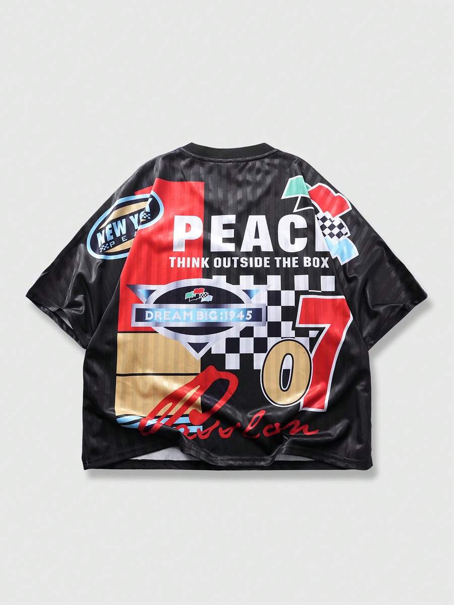 T-shirt ample à col en V pour homme, style streetwear chic et décontracté, imprimé à damier noir et blanc et slogan numérique, été