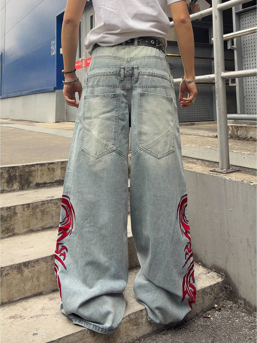 Jeans amples et décontractés style mode de rue pour hommes, avec broderie de dragon et de caractères chinois, lavés. Ceinture non incluse