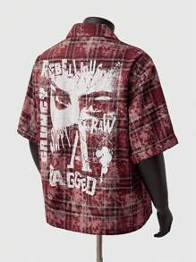 Chemise à manches courtes à coupe large avec imprimé tartan, lettres et graphiques pour hommes